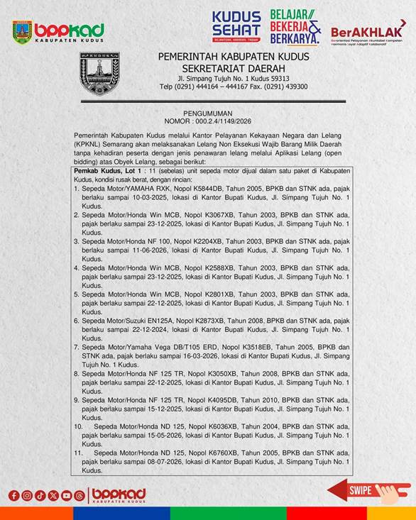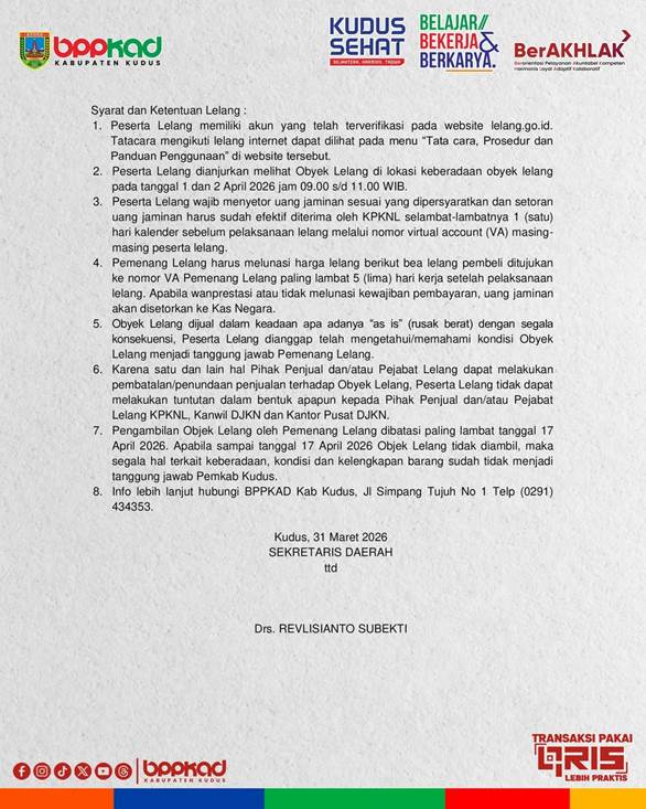 Pengumuman lelang tersebut tertuang dalam surat resmi Sekretariat Daerah Kabupaten Kudus Nomor 000.2.4/1149/2026 yang ditandatangani oleh Sekretaris Daerah, Drs. Revlisianto Subekti. Lelang dilaksanakan tanpa kehadiran peserta (open bidding) melalui platform resmi pemerintah di Direktorat Jenderal Kekayaan Negara, yakni situs lelang.go.id.