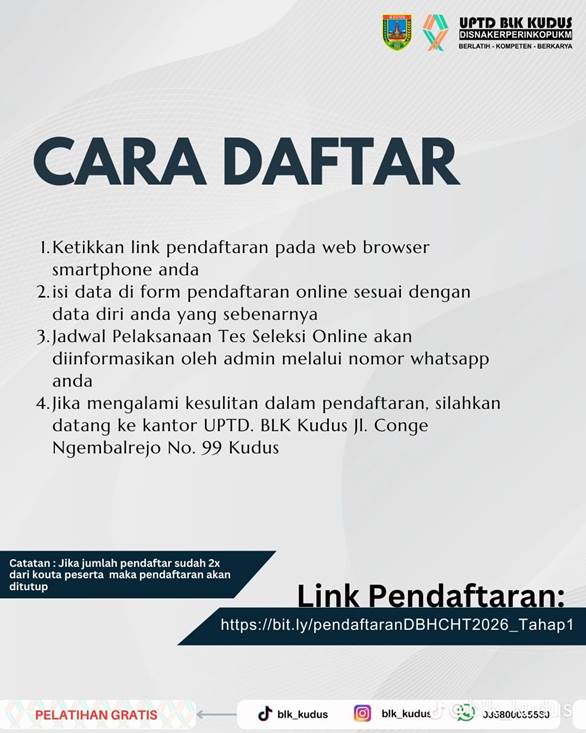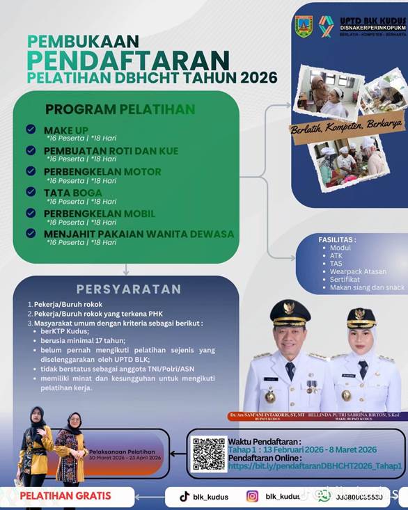 mediamuria.com, KUDUS – Berjalannya waktu pemerintah terus didorong untuk menghadirkan kebijakan yang menyentuh langsung kebutuhan masyarakat, terutama dalam hal peningkatan kualitas sumber daya manusia. Salah satu langkah nyata tersebut terlihat dari dibukanya pendaftaran Pelatihan Dana Bagi Hasil Cukai Hasil Tembakau (DBHCHT) Tahun 2026 oleh Pemerintah Kabupaten Kudus melalui UPTD BLK Kudus. Program ini menjadi bagian dari upaya pemerintah daerah untuk meningkatkan keterampilan kerja masyarakat sekaligus memperkuat daya saing tenaga kerja lokal.