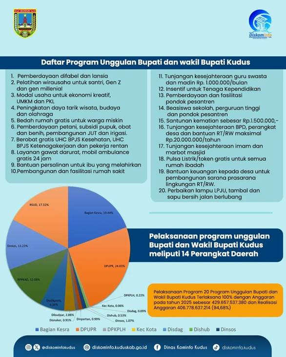 mediamuria.com, KUDUS – Pemerintah Kabupaten Kudus menunjukkan keseriusan dalam menjalankan agenda pembangunan daerah melalui realisasi 20 program unggulan Bupati dan Wakil Bupati Kudus. Berdasarkan data yang dirilis Dinas Komunikasi dan Informatika Kabupaten Kudus, pelaksanaan program unggulan pada tahun anggaran 2025 telah mencapai tingkat realisasi sebesar 94,68 persen dari total anggaran Rp429,6 miliar, dengan nilai serapan anggaran sekitar Rp406,7 miliar.