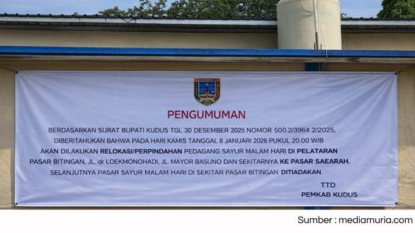 mediamuria.com, Kudus – Pemerintah Kabupaten Kudus resmi memulai relokasi pedagang sayur malam dari kawasan Pasar Bitingan ke Pasar Saerah pada Kamis (8/1/2026) malam pukul 20.00 WIB. Kebijakan ini dilakukan sebagai bagian dari penataan kawasan pasar dan peningkatan kualitas pelayanan publik di sektor perdagangan rakyat.