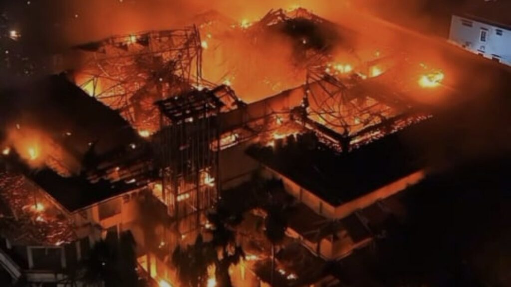 Kemudian, pagar besi gerbang tersebut juga jebol dirusak. Kemudian, pos penjagaan juga mengalami berantakan bagian kaca pecah. Setelah melakukan aksi perusakan dan pembakaran, masa dari kalangan pelajar dan mahasiswa ini kabur setelah dibubarkan dengan tembakan gas air mata oleh kepolisian.