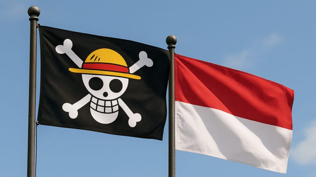 One piece sendiri merupakan serial anime dari jepang yang mengisahkan petualangan seorang bajak laut yang ingin menjadi seorang raja bajak laut. Simbol bendera bajak laut ini sendiri di artikan sebagai wujud perlawanan kepada penguasa pemerintahan. Dari serial animenya sendiri One Piece menceritakan bagaimana kejamnya seorang penguasa yang di kenal sebagai “Ternyubito” bangsawan dunia atau sebagai naga langit.