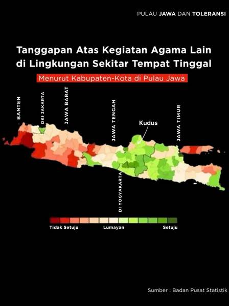 Jika dilihat secara keseluruhan, wilayah Pulau Jawa menunjukkan variasi yang cukup beragam dalam hal penerimaan terhadap kegiatan keagamaan lain. Beberapa daerah di Jawa Barat tampak didominasi warna merah hingga oranye, yang mengindikasikan tingkat penolakan relatif lebih tinggi. Sementara itu, wilayah Jawa Tengah, termasuk Kudus, serta sebagian Jawa Timur, cenderung didominasi warna hijau.