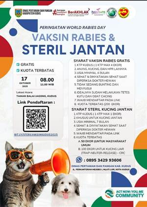 mediamuria.com, Kudus – Dalam rangka memperingati World Rabies Day atau Hari Rabies Sedunia, Dinas Pertanian dan Pangan Kabupaten Kudus kembali menggelar kegiatan Vaksin Rabies dan Steril Kucing Jantan Gratis. Acara ini dijadwalkan berlangsung pada hari Kamis, 17 Oktober 2025, mulai pukul 08.00 hingga 11.00 WIB bertempat di Taman Balai Jagong, Kudus.